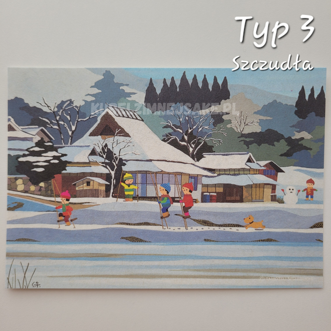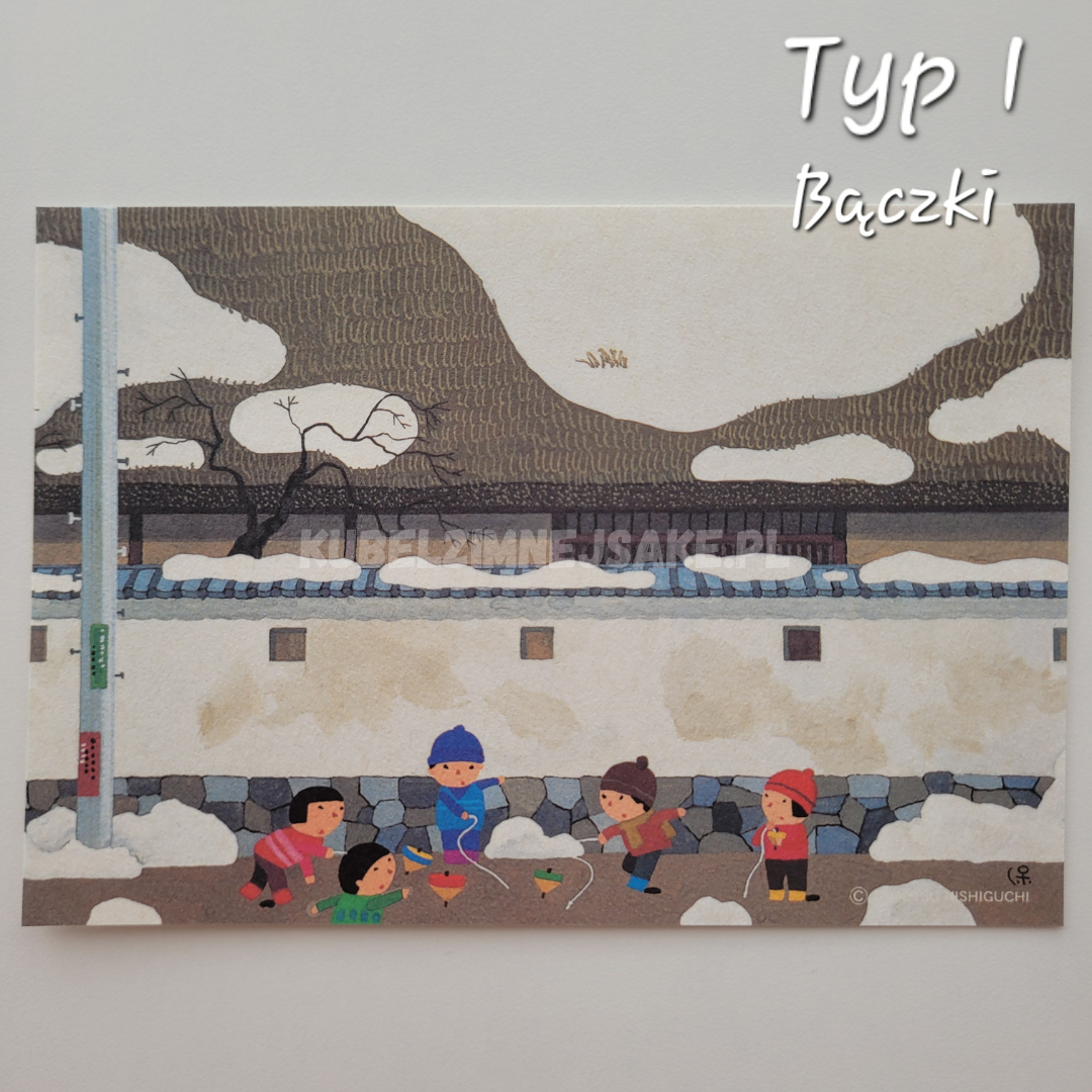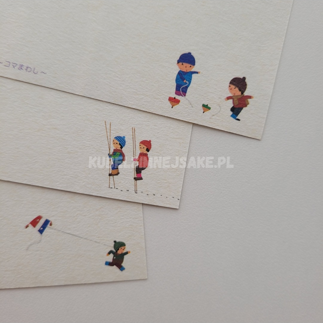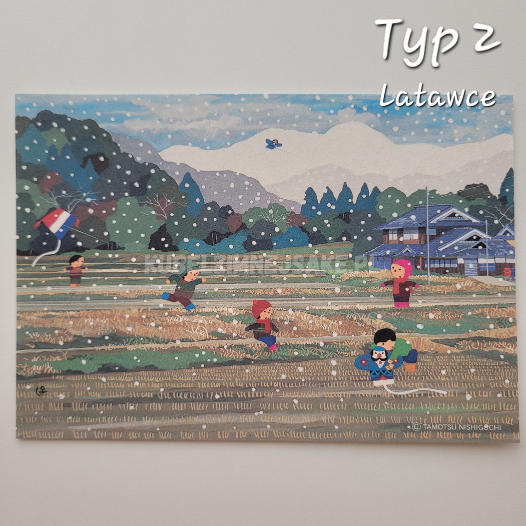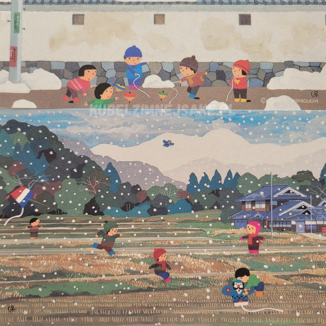 Pocztówki z "Serii Cieszącej Serce" autorstwa ilustratora Tamotsu Nishiguchi z Osaki przedstawiające dzieci bawiące się na dworze zimową porą. Każda pocztówka ma dodatkową mini ilustrację także z tyłu.