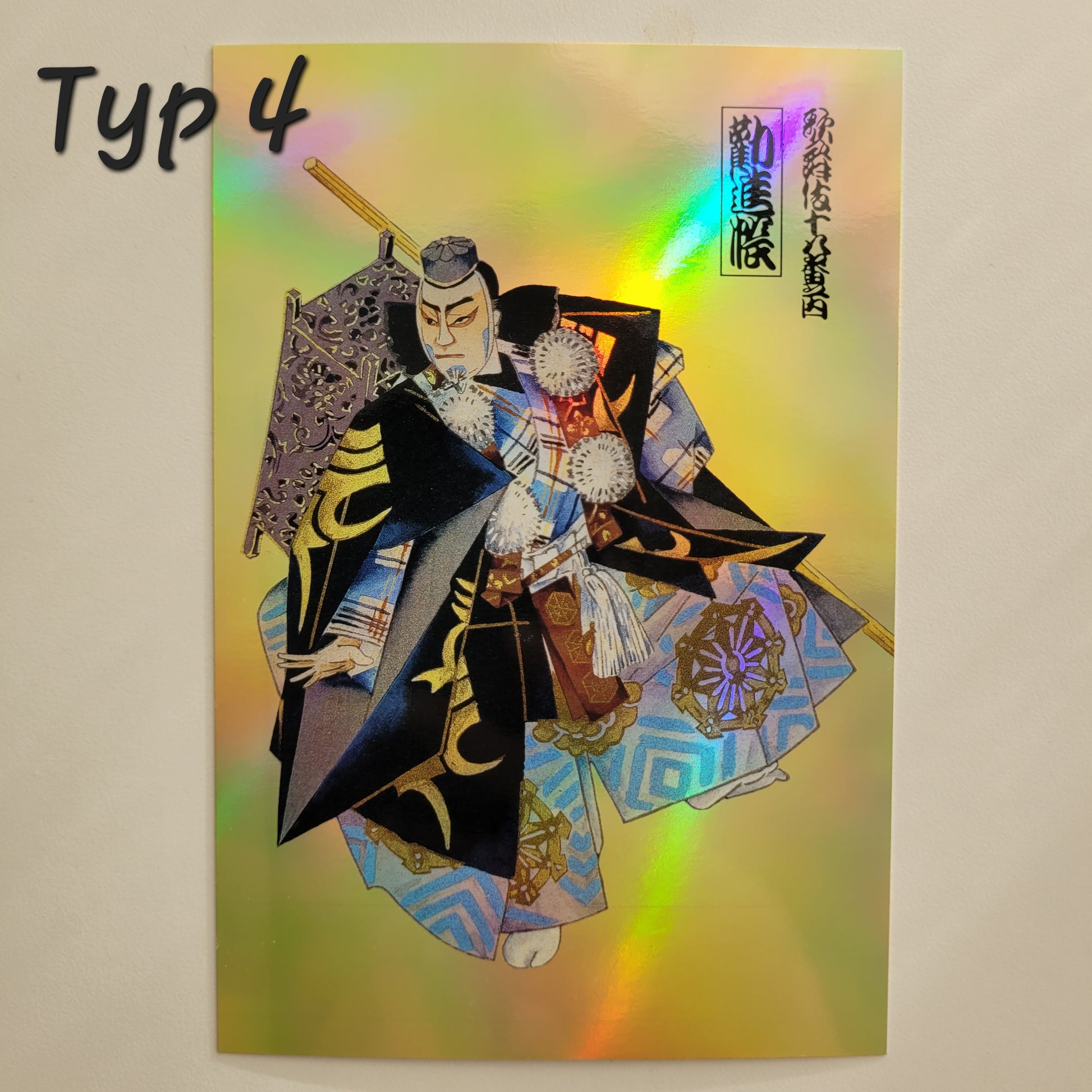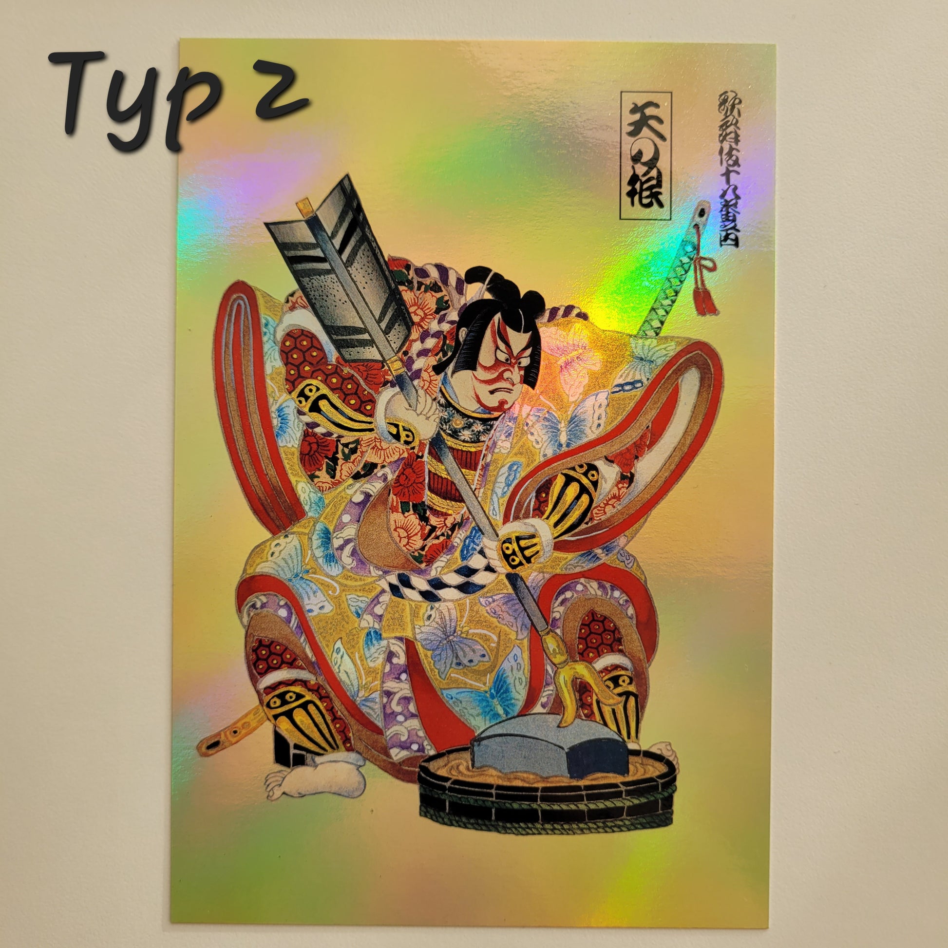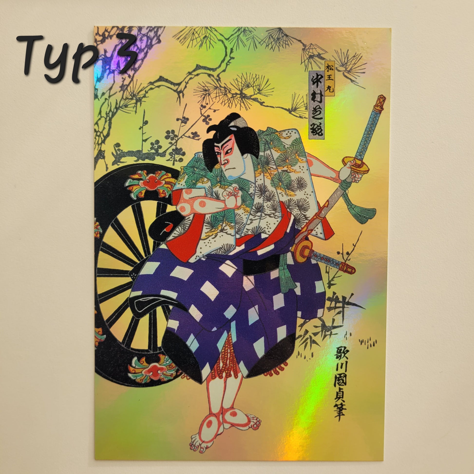 Wyjątkowa, mieniąca się pocztówka przedstawiająca aktorów japońskiego teatru kabuki.