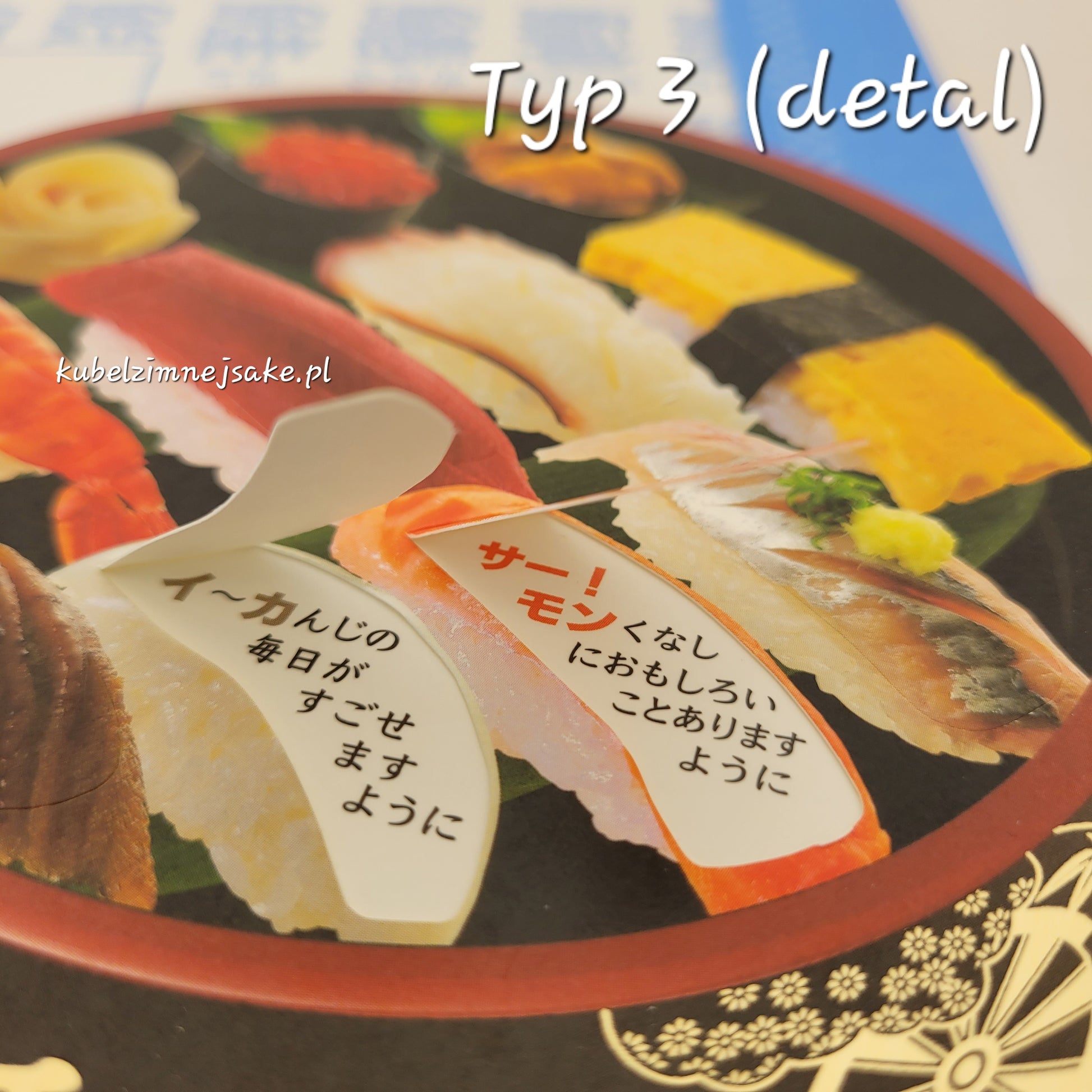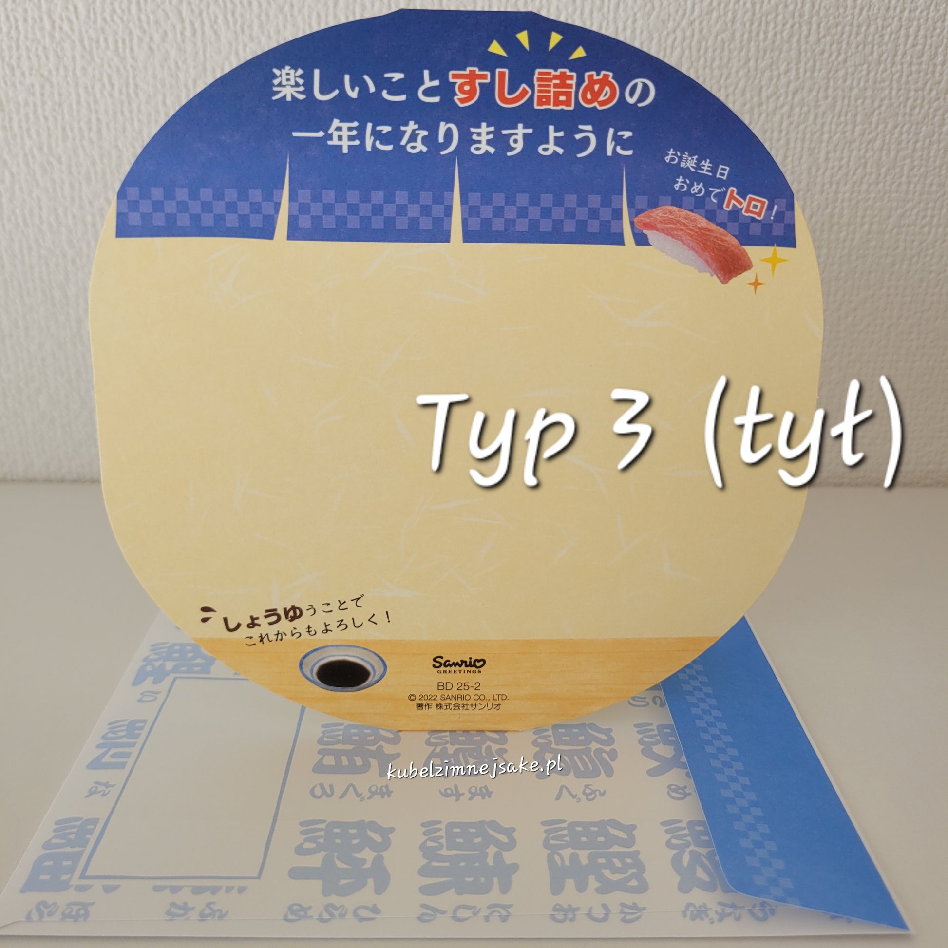 Typ 3: Rozkładana kartka do postawienia z porcją sushi. Każde sushi otwiera się, odkrywając różne życzenia urodzinowe będące grą słowną z nazwą danego dodatku do sushi. Kartka sprawdzi się szczególnie dobrze jako prezent dla uczących się języka japońskiego.