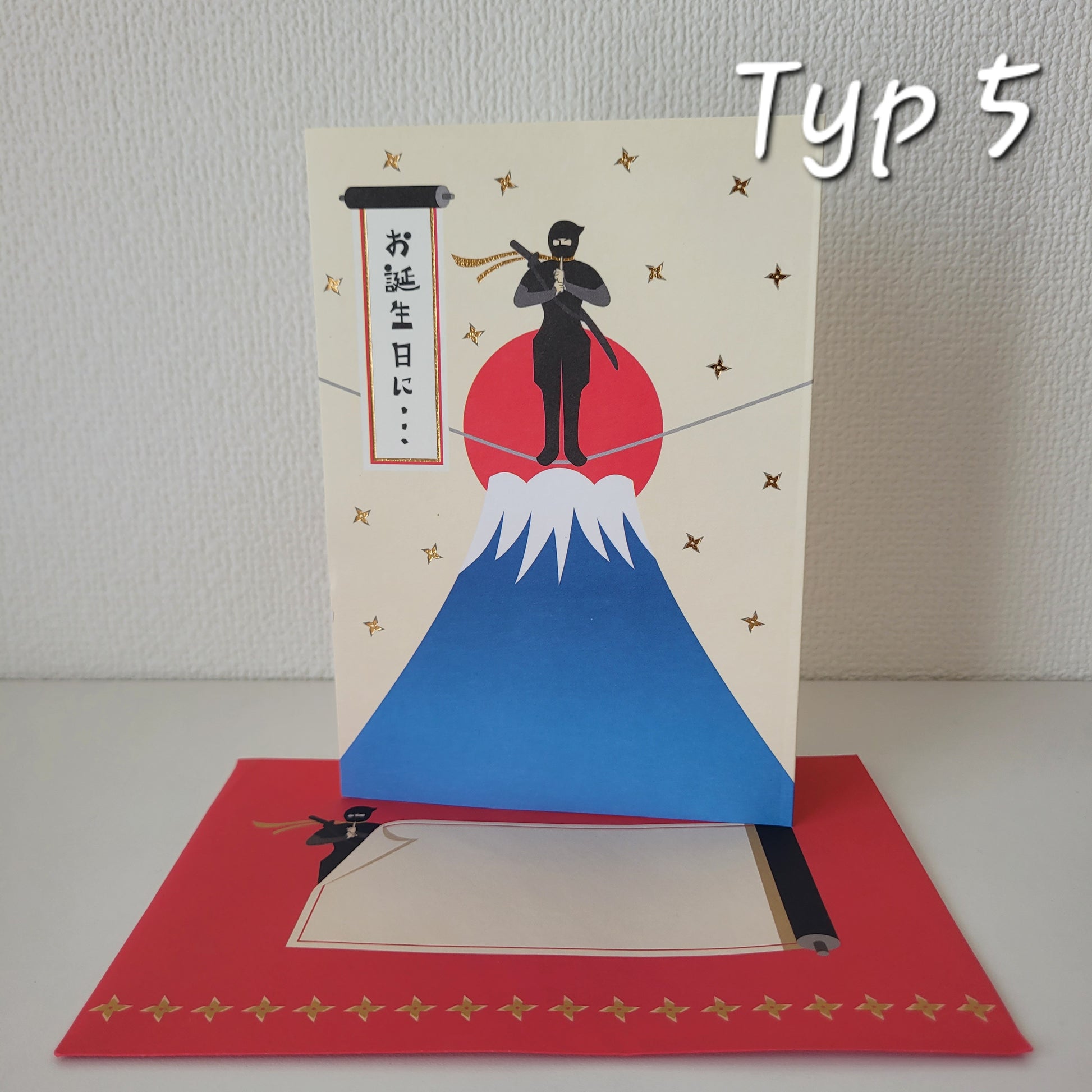 Typ 5: Kartka rozkładająca się w wyskakujących na adresata ninja z sakiewkami złota i dużym napiszem "Omedetou gozaimasu"- Wszystkiego najlepszego (z okazji urodzin).
