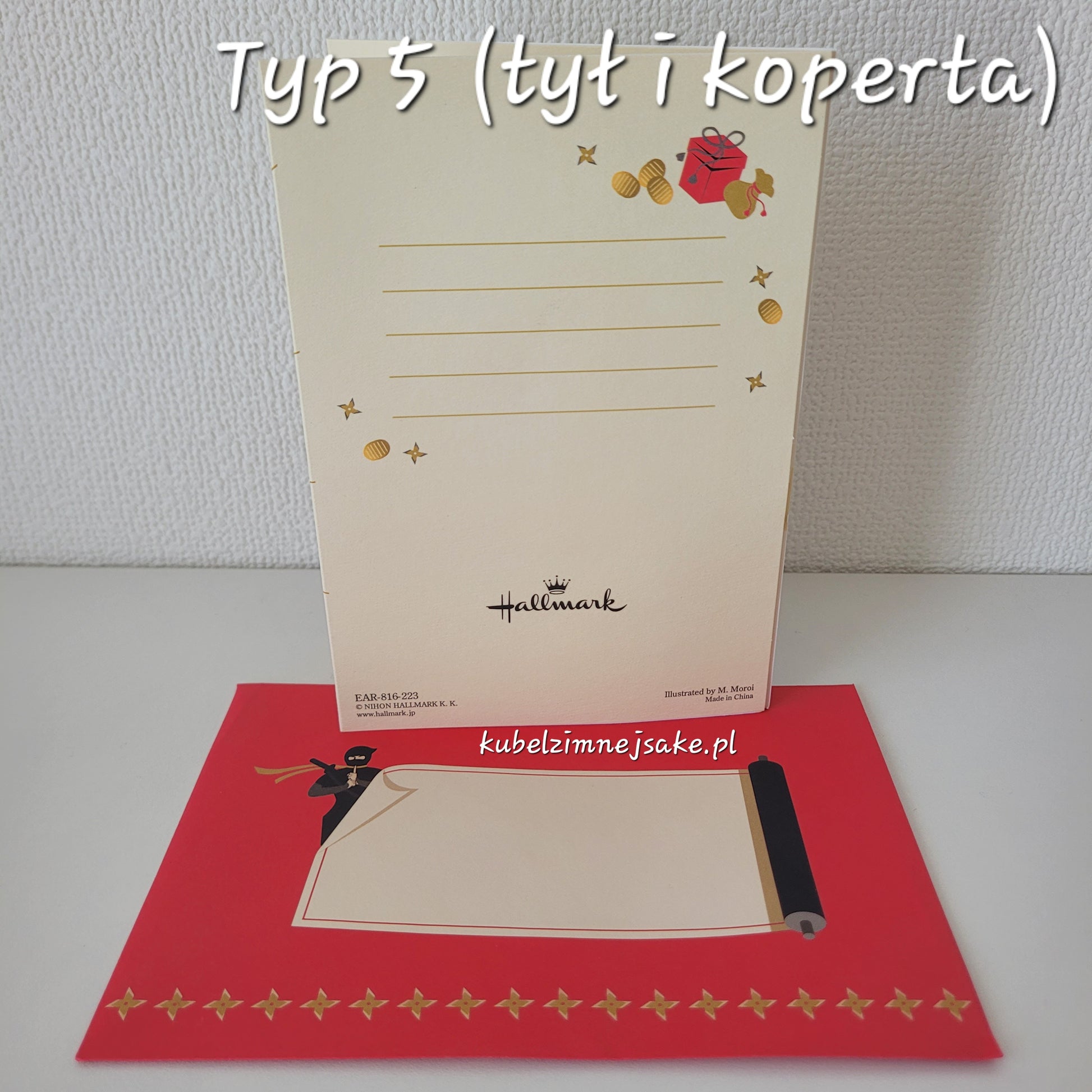 Typ 1: Kartka rozkładająca się w kształt japońskiego zamku, z przeróżnymi symbolami Japonii na włościach- laleczkami kokeshi, darumą, kotkiem maneki neko, tradycyjnymi domami gassho-zukuri, oraz origami.
