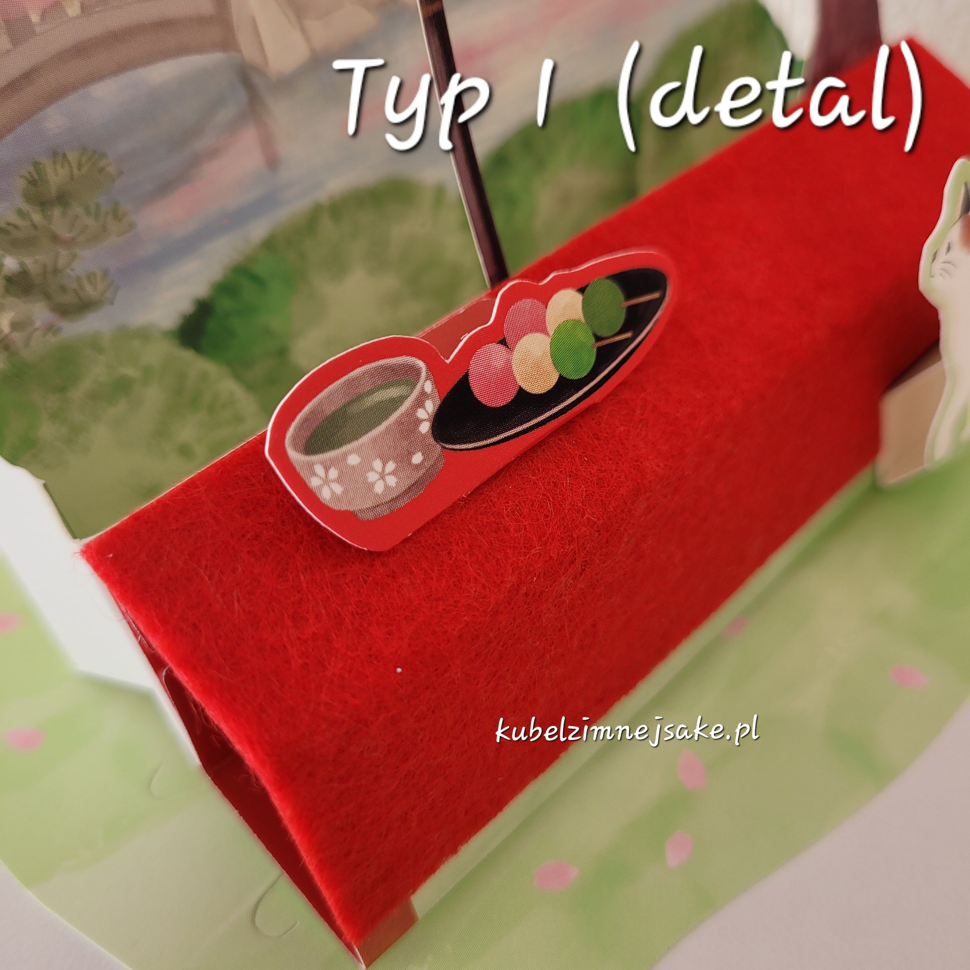 Typ 1: Rozkładana kartka ze scenką rodzajową: Wiosna w Japonii z herbatą matcha i słodyczami dango w ogrodzie japońskim. Ławka na kartce zrobiona jest z tego samego czerwonego materiału którym naprawdę pokrywane są ławki w ogródkach herbacianych w Japonii.