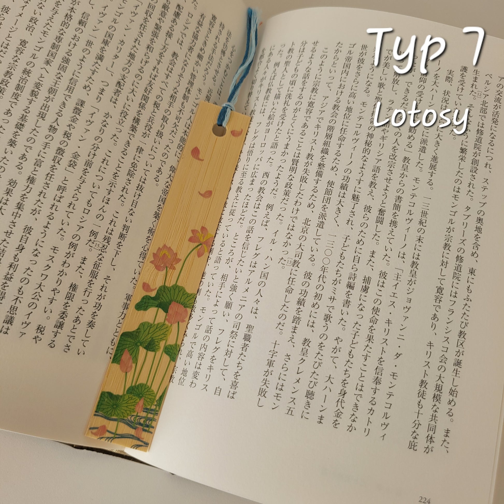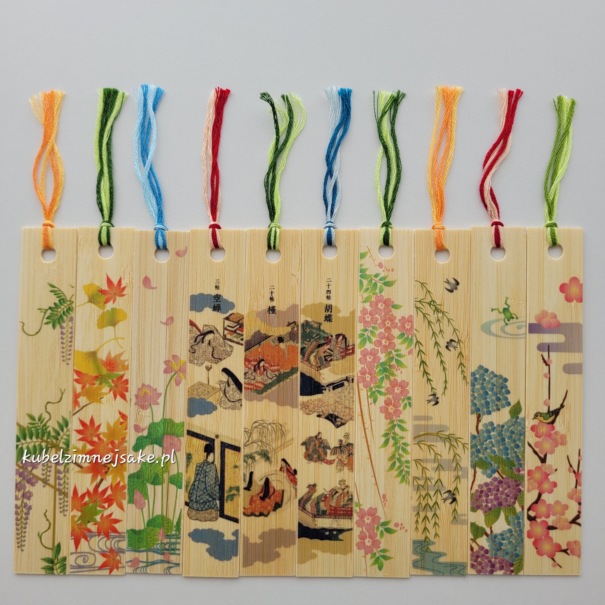 Piękne bambusowe zakładki do książek z motywami na każdy sezon- kwiaty wiśni na wiosnę, lotosy na lato, klony na jesień, kamelie na zimę, oraz wiele więcej... dostępne są też trzy wzory zakładek przedstawiające rozdziały z 11-wiecznego dzieła literackiego Genji Monogatari (Opowieści o Genjim).